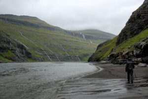Abstieg in die grün-feuchte Lagune von Saksun mit seinen tiefen und wasserfalldurchzogenen Steilhängen.