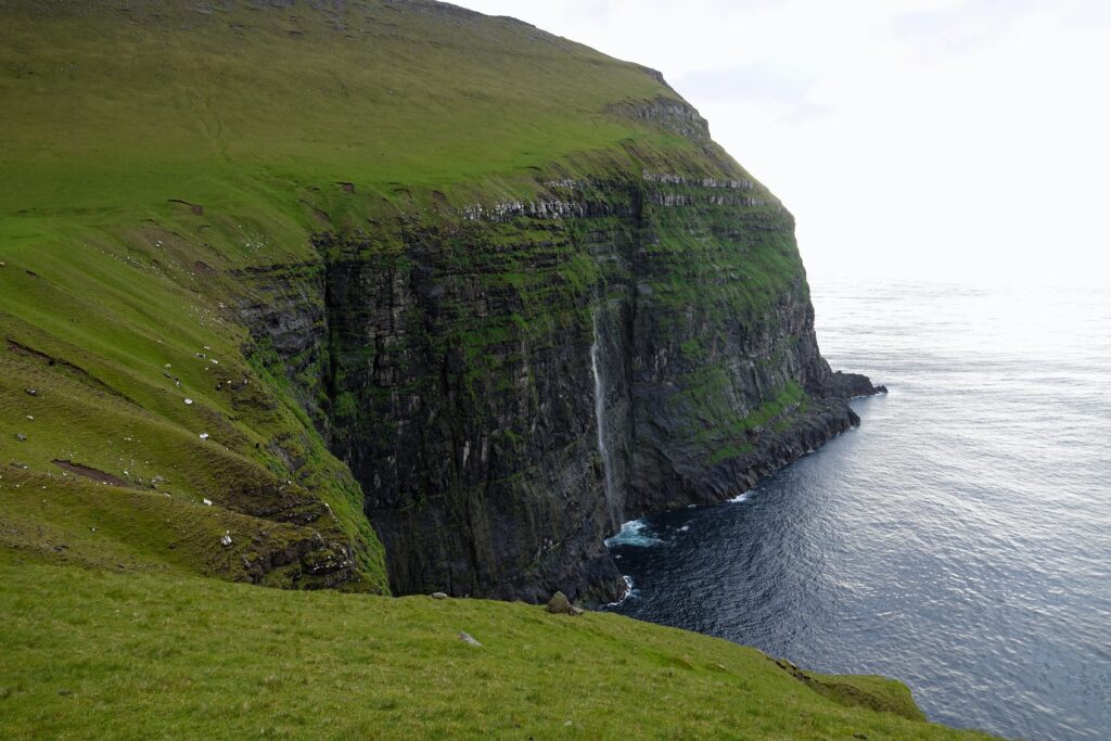Der Gjógv Loop ist ein spannender Klippenweg hinauf auf ein grünes Plateau mit Ausblick auf Kalsoy und die Ortschaft Gjógv.