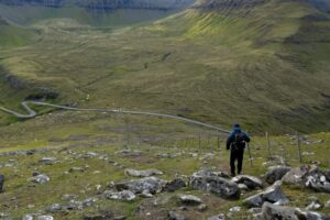 Mit dem Auton in 50min von Tórshavn zum kleinen, kostenlosen Wanderparkplatz oberhalb der Ortschaft Funningur. Der Parkplatz befindet sich am Gatter nach der Serpentine Richtung Gjógv.