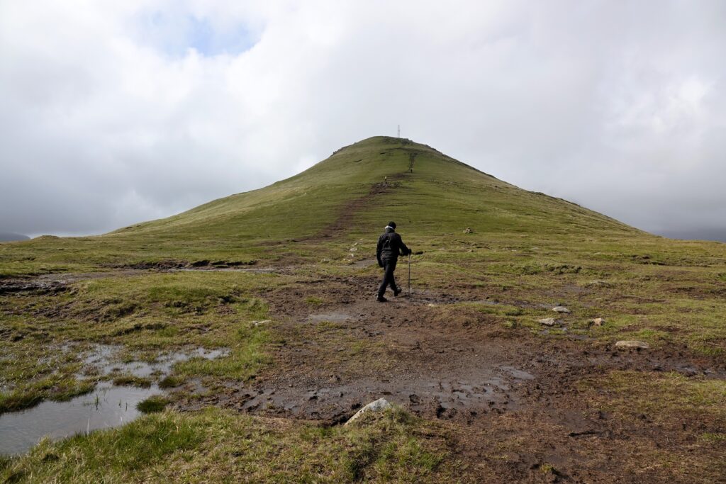 Kurzaufstieg über einen grünen Bergrücken zum Klakkur, einem der spektakulärsten Aussichtspunkte bei Klaksvik.