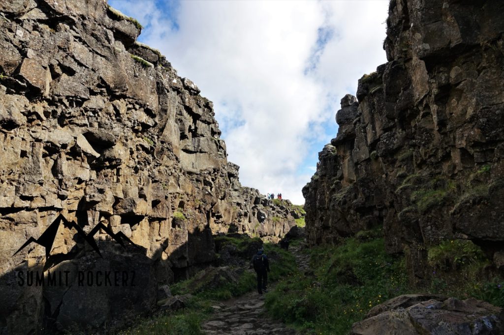 Vom Wasserfall geht es ein kurzes Stück zurück zu den Aufstiegsstufen, hier laufen wir jedoch nicht wieder hinab, sondern folgen dem Holzbohlenweg geradeaus. Ab hier schwinden die Massen und es kehrt etwas Ruhe ein. Der Weg verläuft sehr schön durch eine immer enger werdende Schlucht, die im Langistígur bzw. im „dead man walk“ nur wenige Meter breit ist. Am Ende der Schlucht befindet sich ein kleiner Aussichtpunkt mit dramatischer Sicht über die Kontinentalspalte. Diesen sollte man sich bei einem Besuch des Þingvellir nicht entgehen lassen.